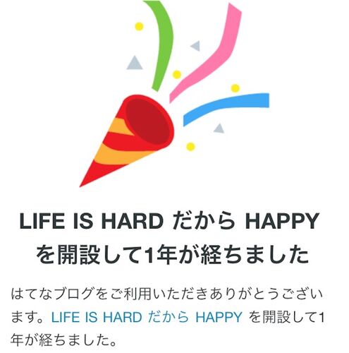 19.09.14 はてなブログから珍しくメールが。 開けてみると、 このブログを開設して1年が経ったそうです。 わーい( ˶´⚰︎`˵ ) 記事総数: 50 総pv数: 19868 うーん、別に数としてどうって 数字じゃないんですけど。 特になにしたわけでもなく、 更新頻度も高く…